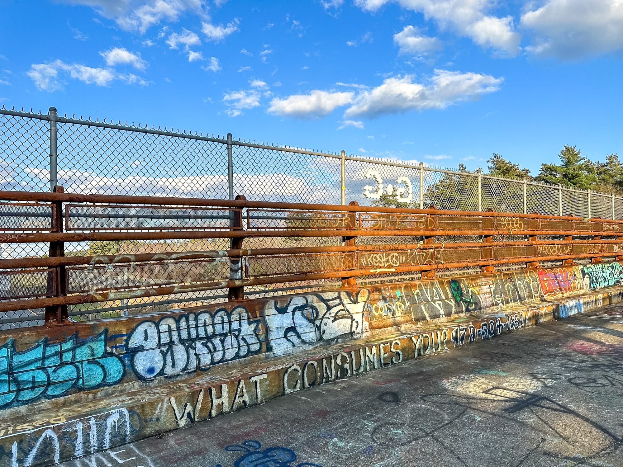 - After about 0.6 miles (roughly 10 minutes), the road ascends slightly — and the graffiti-covered overpass appears ahead, spanning the highway below.