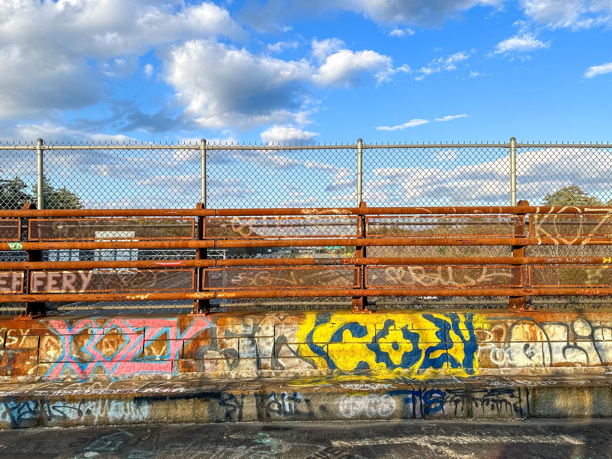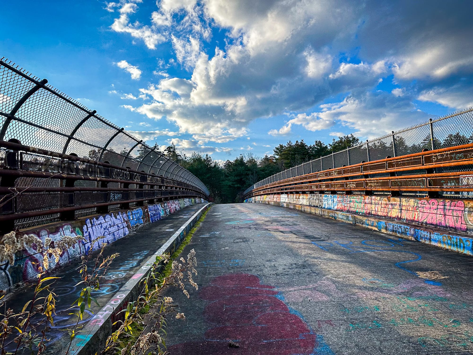 Today, the overpass has fallen into disrepair. Its once-paved surface is cracked and weathered; rust streaks its girders; weeds sprout between the seams. The bridge’s guardrails are tagged with layers of graffiti, and vegetation creeps along its edges.