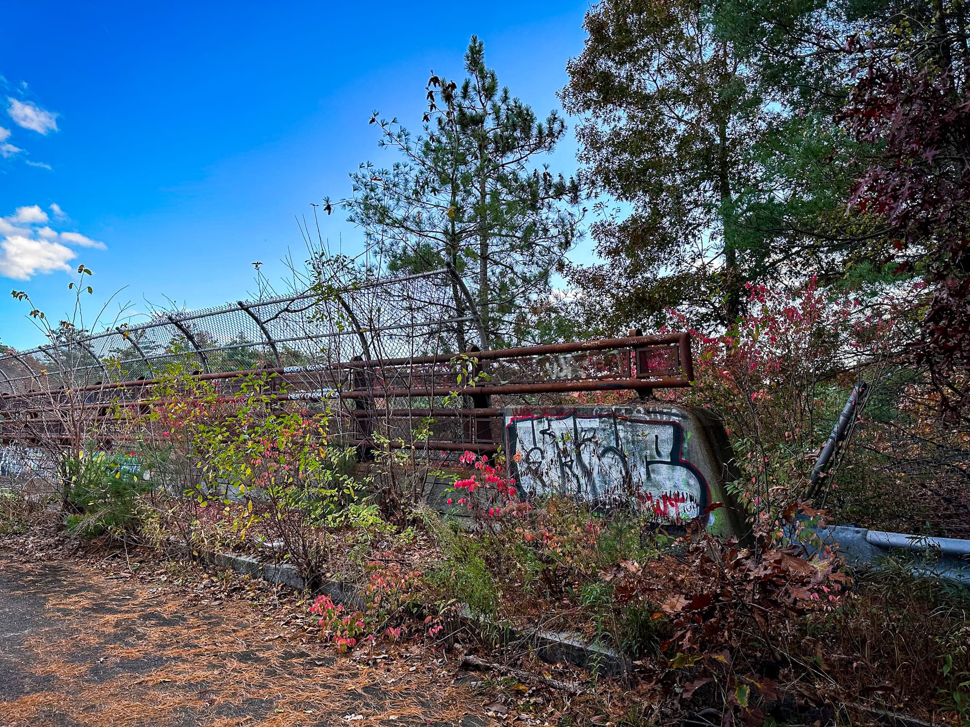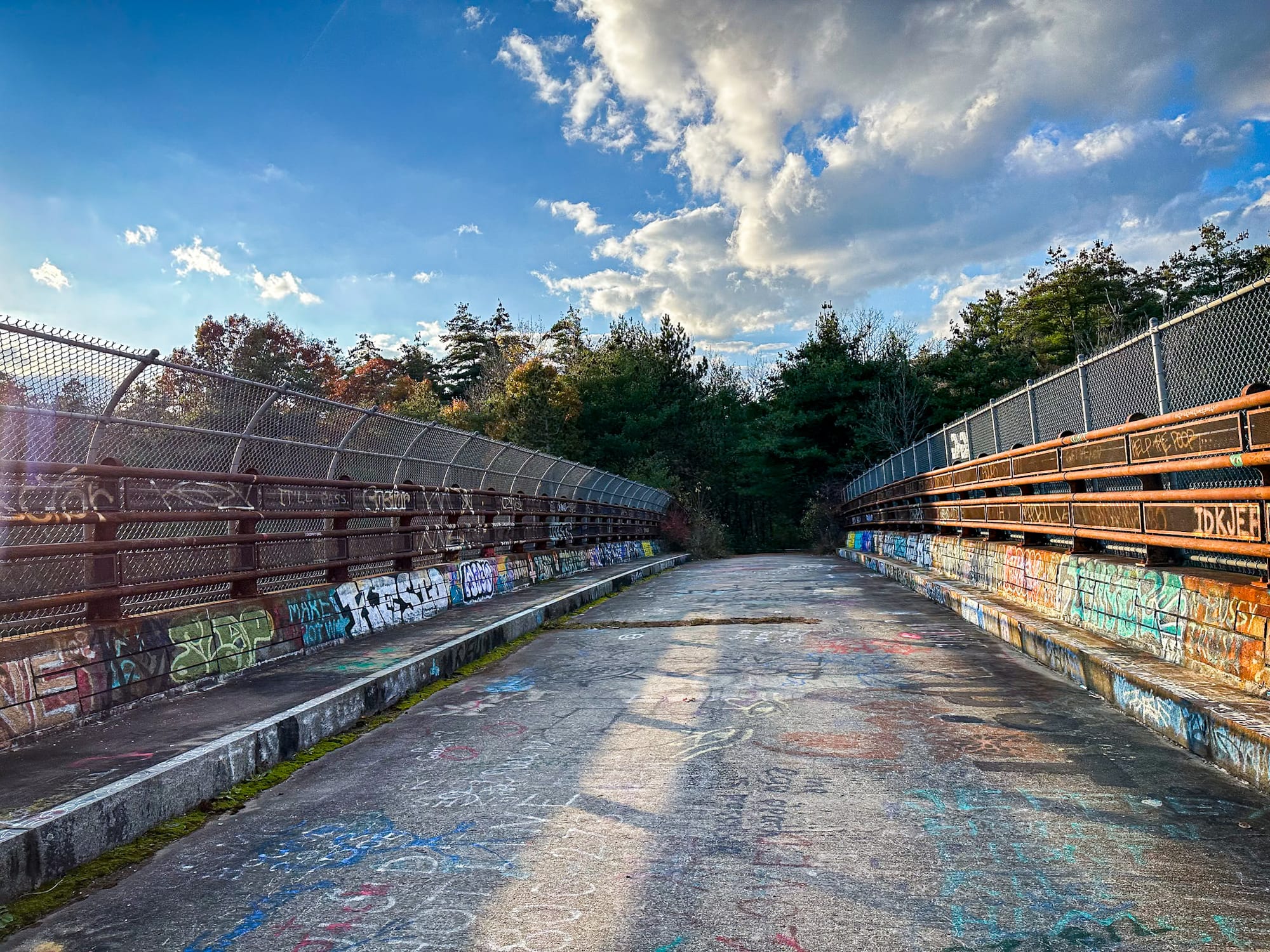 Hidden deep within the Georgetown-Rowley State Forest lies an abandoned overpass spanning Interstate 95 — a rusting, graffiti-covered bridge with a fascinating backstory dating to the 1970s.
