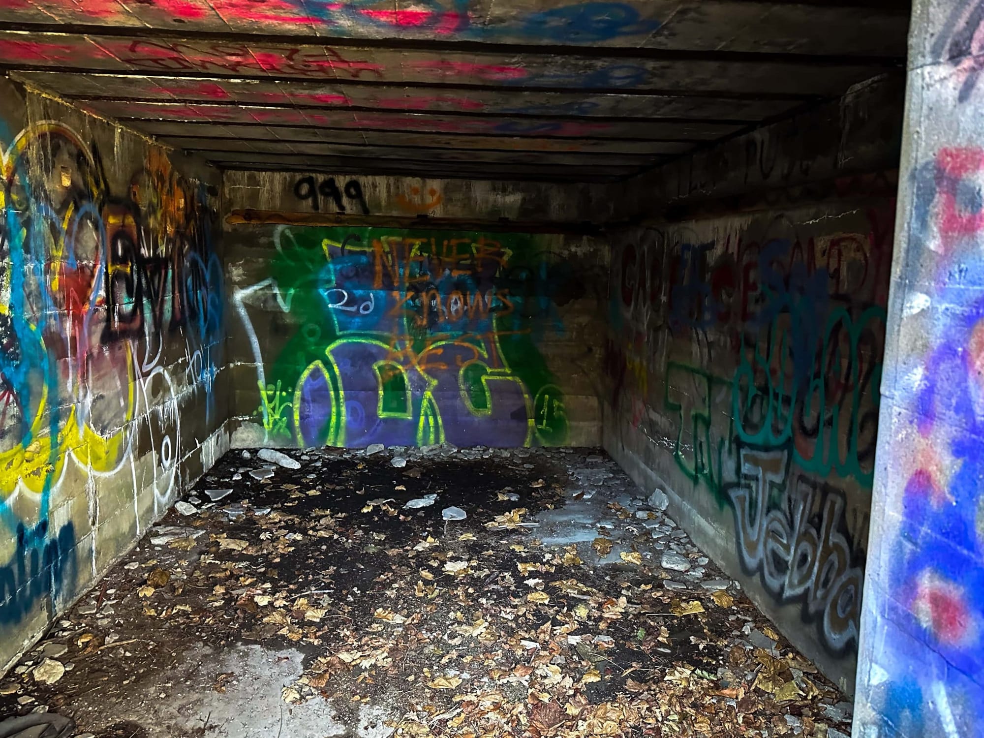 Visitors can walk across the top of the structure or explore inside its concrete corridors, where open stairways and rusting doorframes lead through dimly lit rooms and echoing chambers. Many of the walls are now covered in colorful graffiti, giving the site a unique mix of decay and artistry.