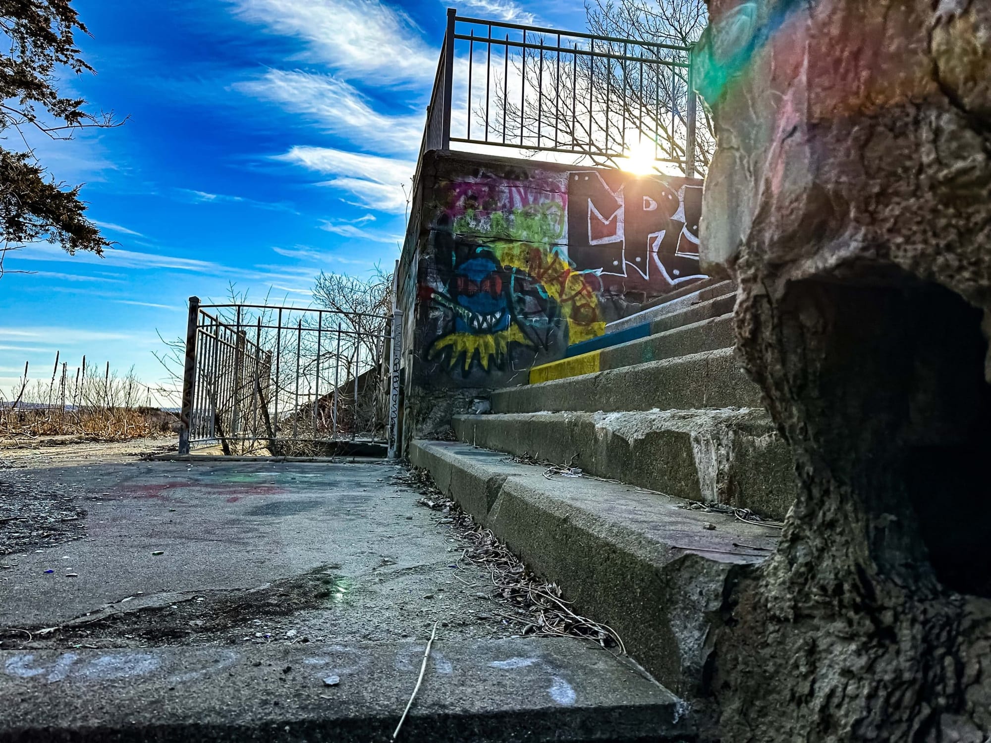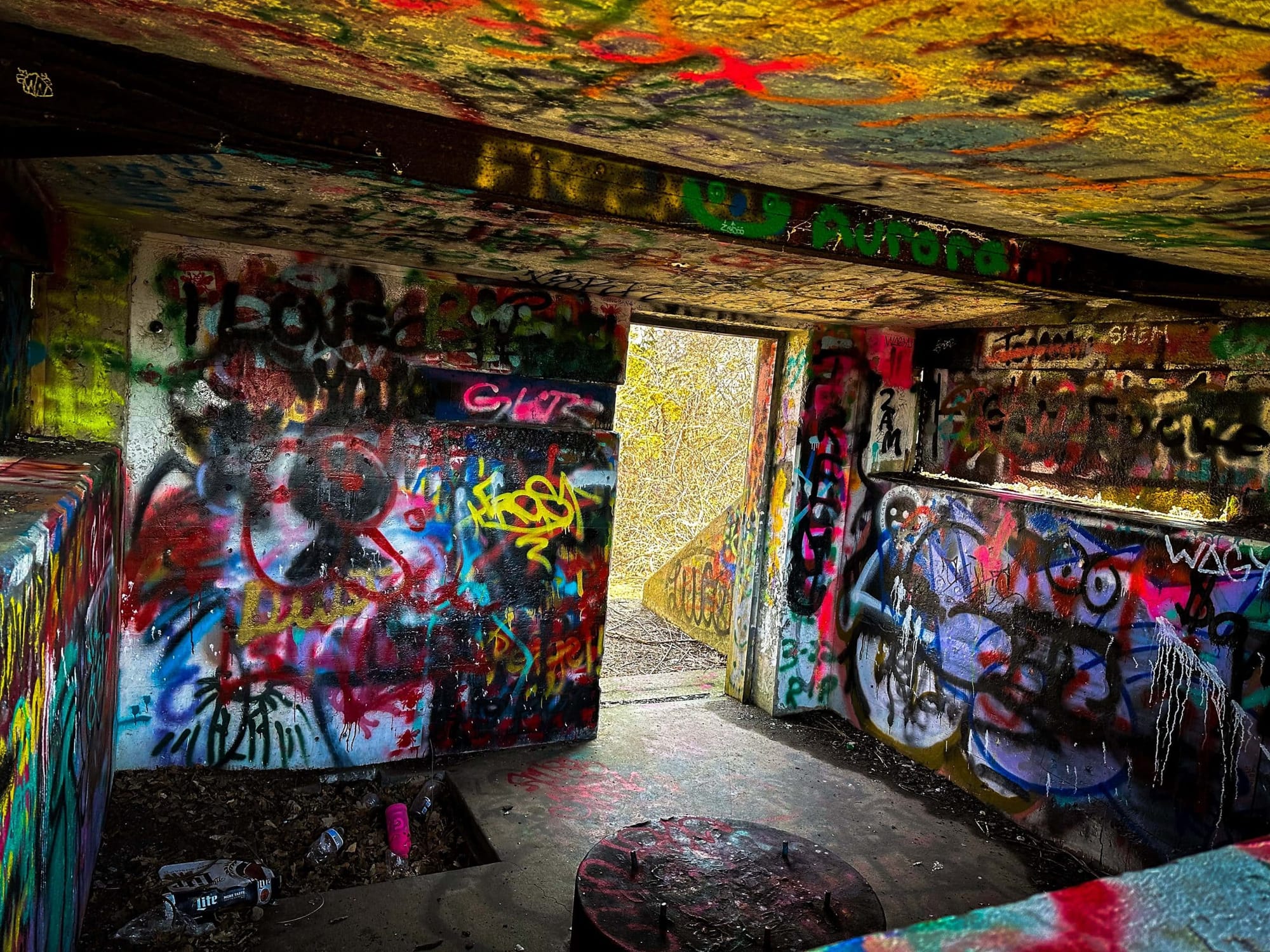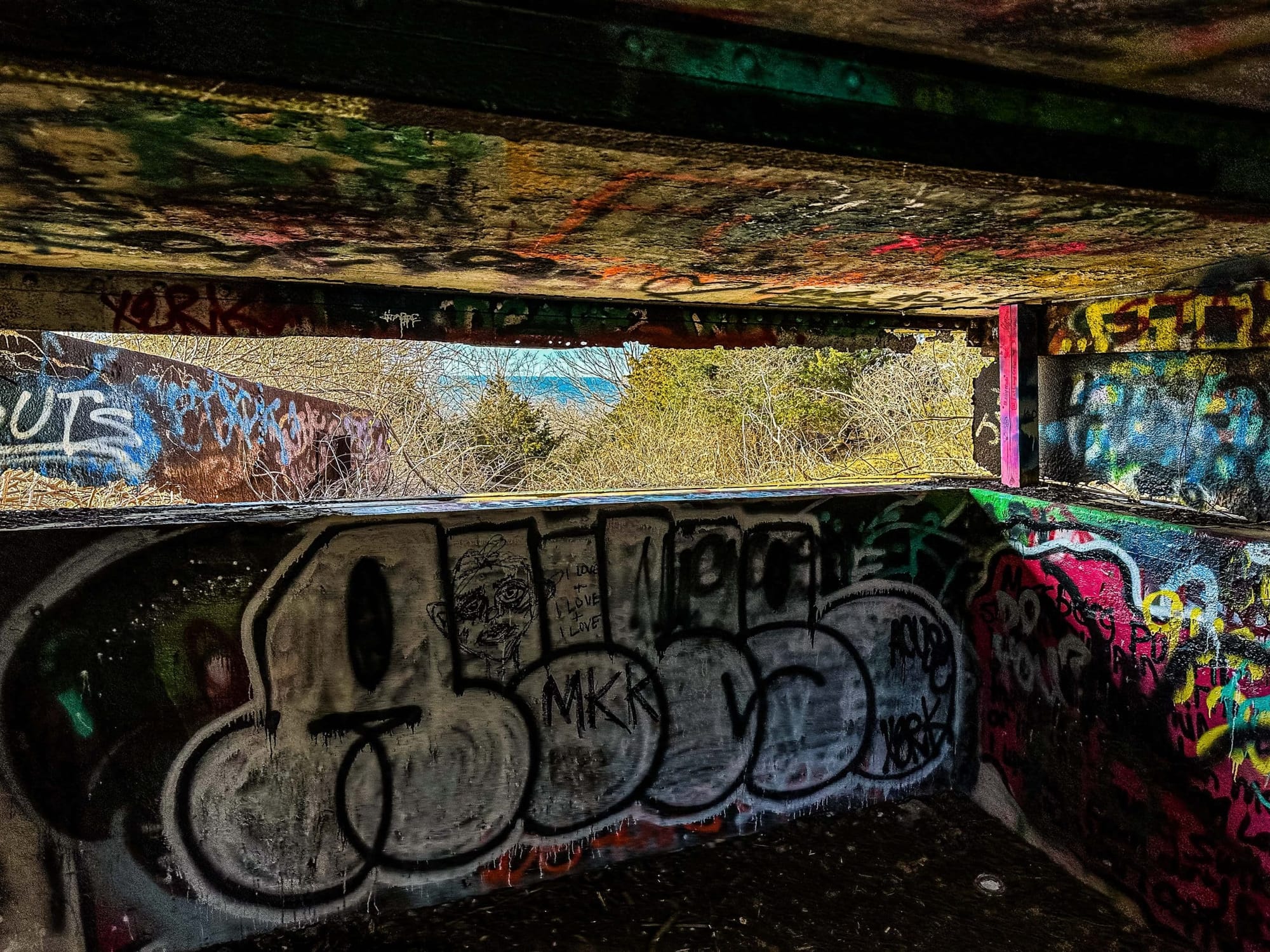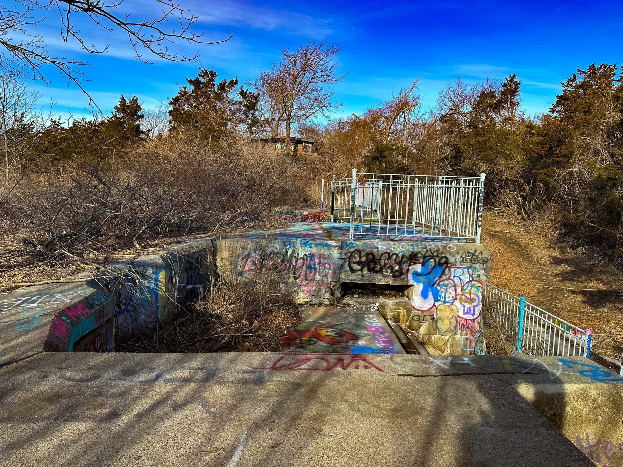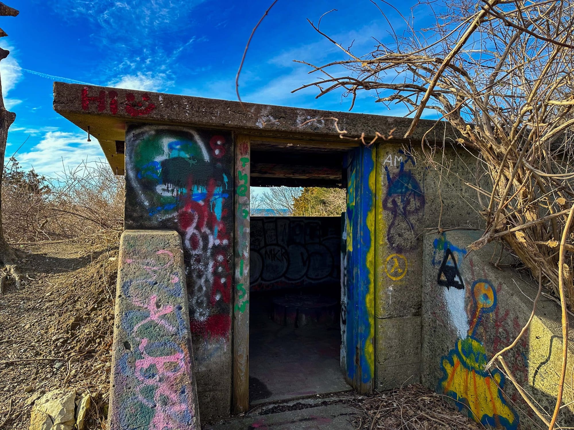 Visitors can freely walk atop the structure or explore its interior, including the atmospheric fire-control post on the west side. Open stairways lead between levels, and many rooms remain accessible. However, as with other abandoned batteries, it’s essential to explore cautiously — the concrete floors can be slick, and much of the site is covered in colorful graffiti that now defines its urban-exploration charm.