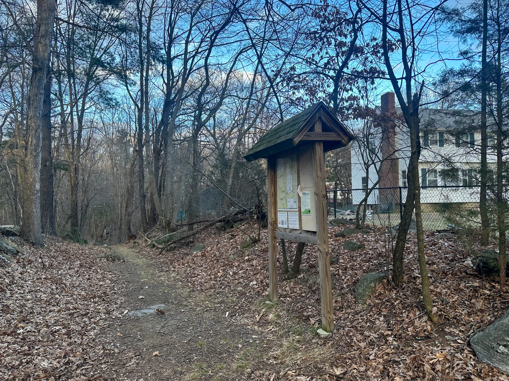 One of the unusual things about Camp Wunnegan is that getting to it feels a little strange. The trailhead sits directly between two residential houses on Grafton Street. There's no designated parking lot, no wide-open entrance—just a narrow opening in the trees, a kiosk, and a sudden transition from suburbia to wilderness.