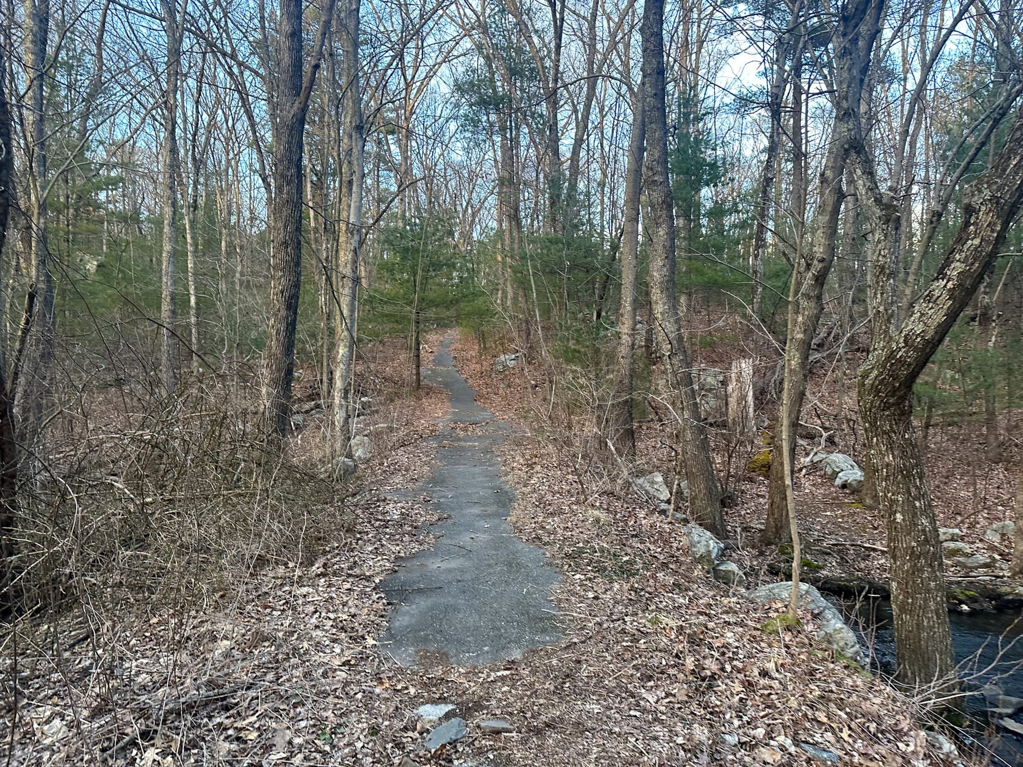 From the Grafton Street entrance, the trail descends toward Big Bummet Brook, a surprisingly scenic stream that flows year-round. A sturdy culvert provides an easy crossing, and the brook adds a calming ambience to the small valley at the base of the hill.