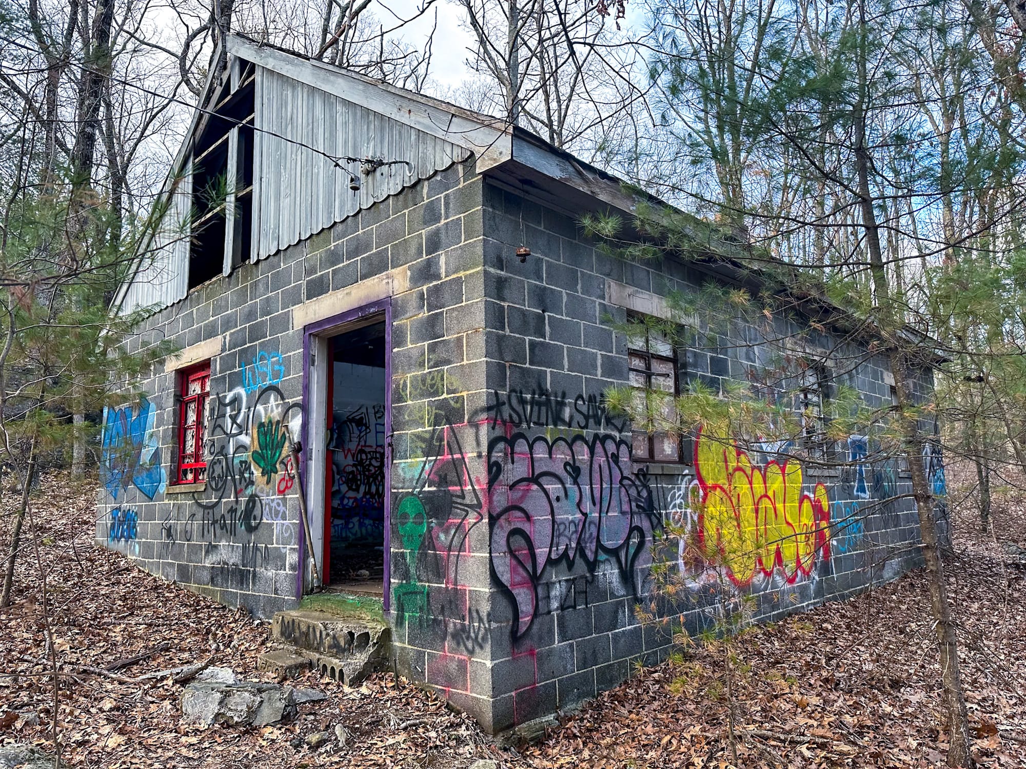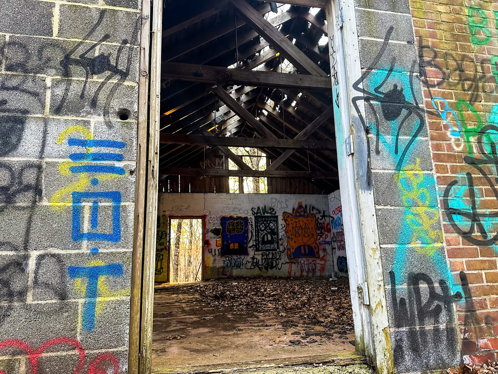 The first major structure you’ll see is the former dormitory, a cinder-block building tucked into the side of the hill. Today, the structure remains standing and is completely accessible. Doors are open on both sides, making it easy to safely enter and exit.