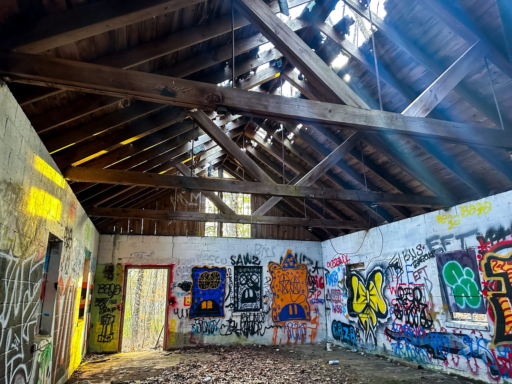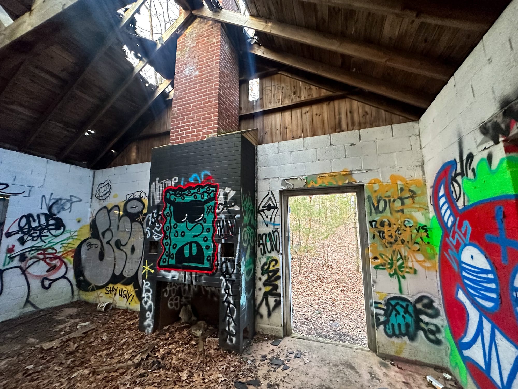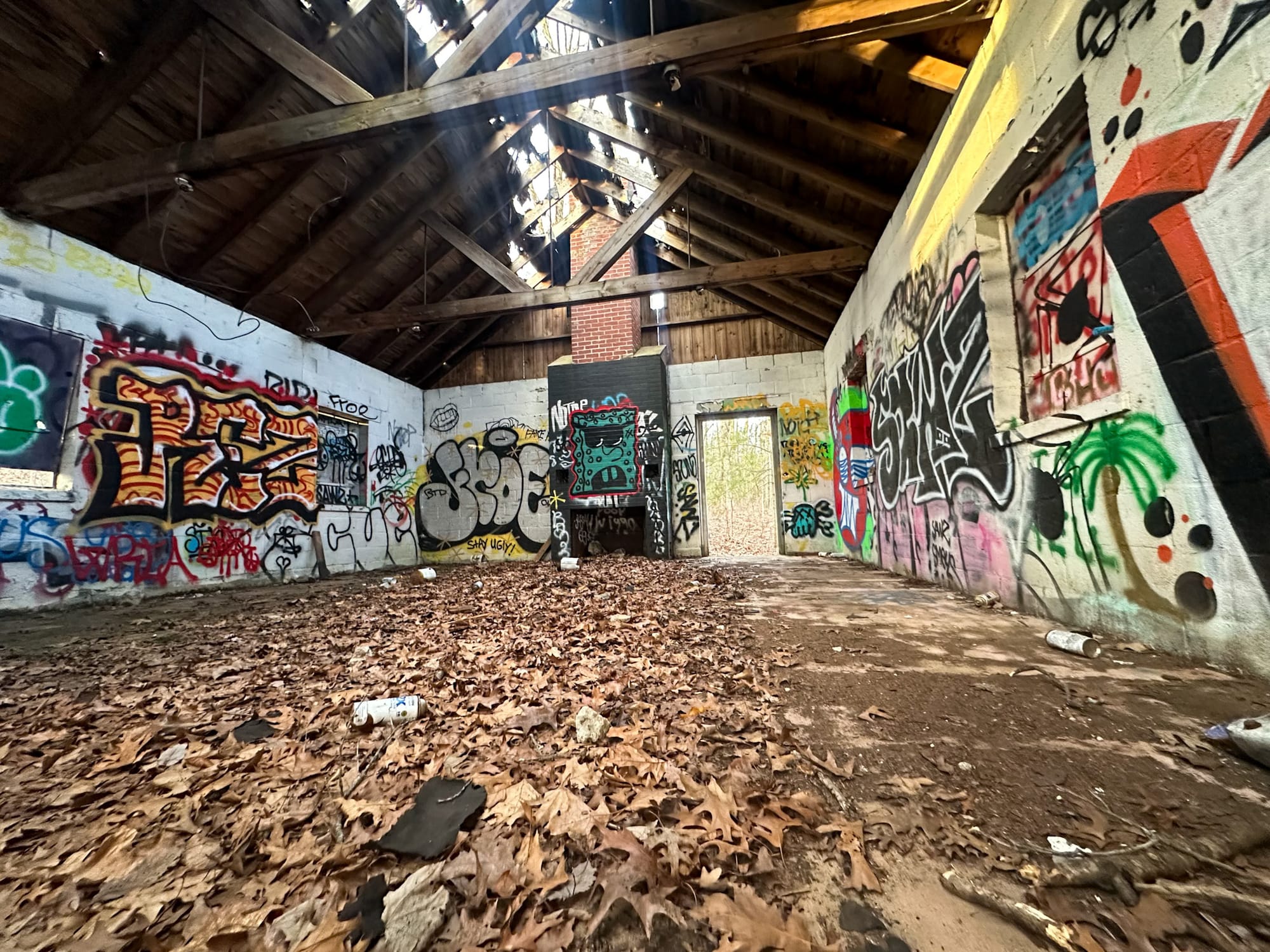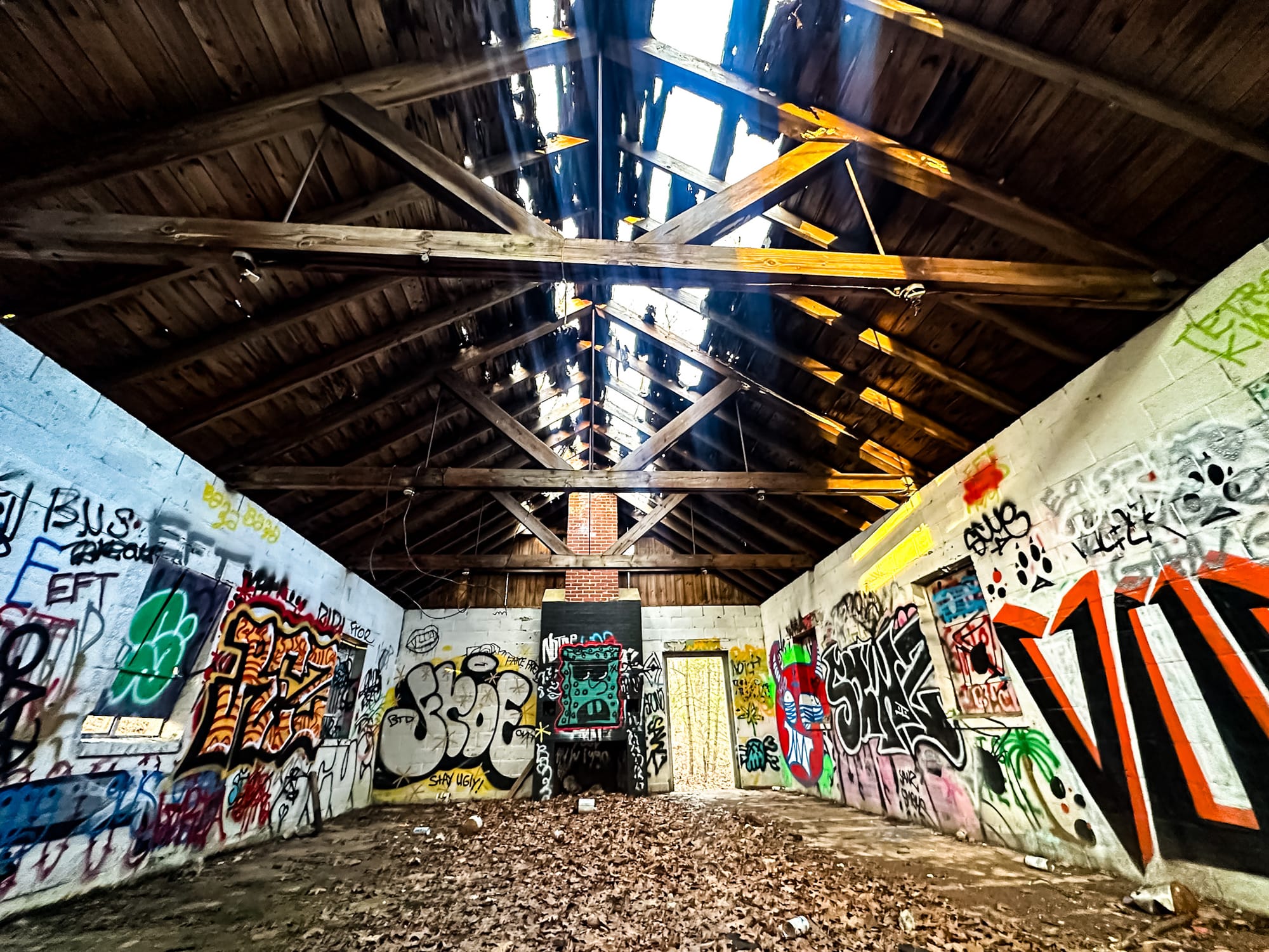 The building itself was destroyed by fire in August 1971. Today, only the stone chimney and an old fire ring remain, giving you a haunting sense of where the camp’s main gathering space once stood.