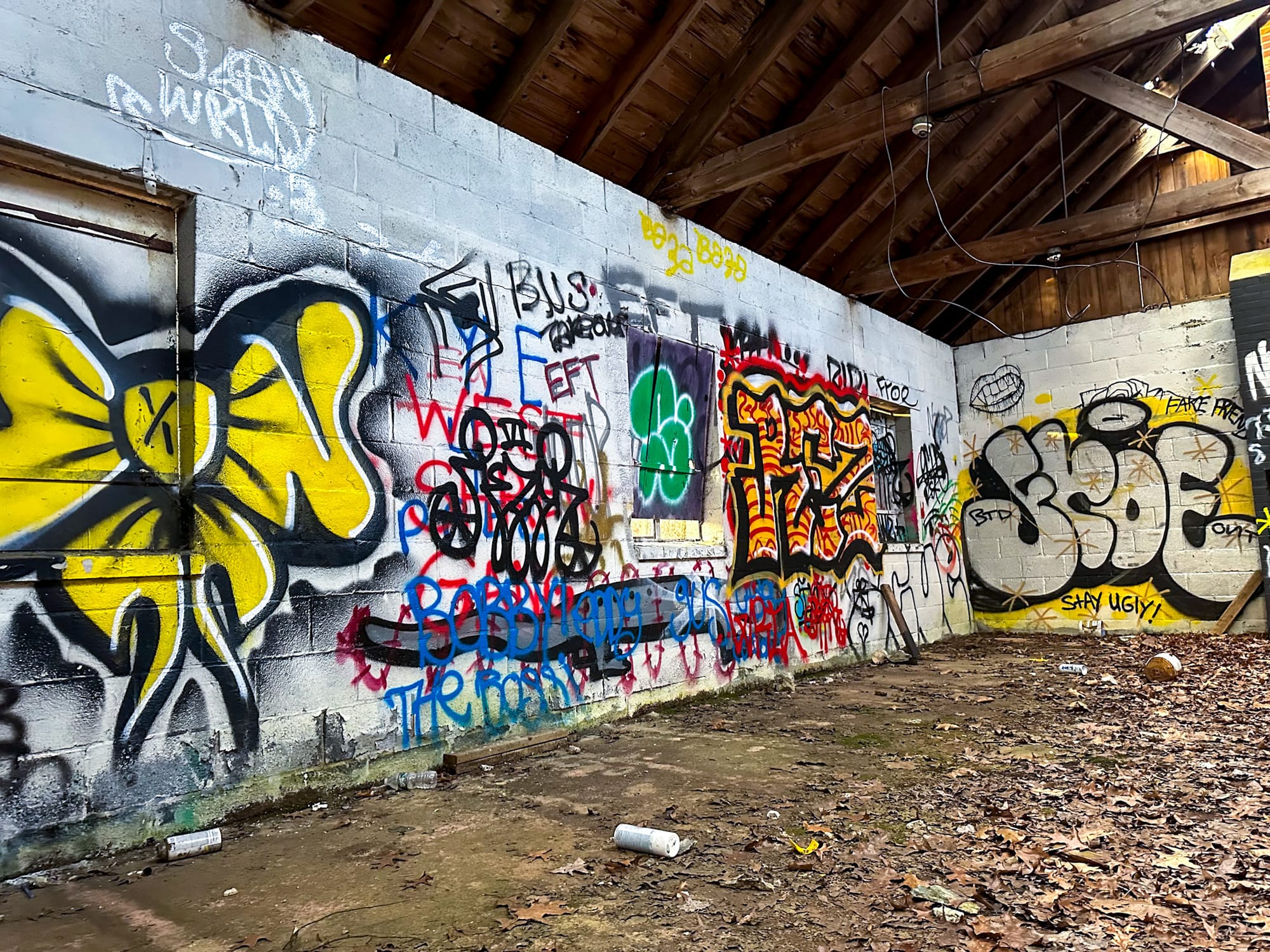 - Trash, broken glass, empty spray cans, and debris scattered across the floor