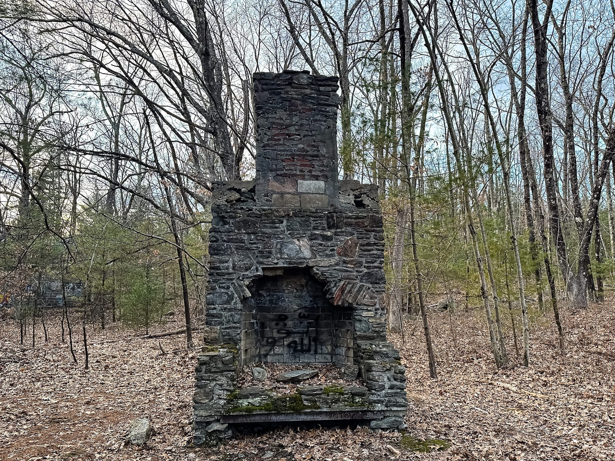 Directly across the trail from the dormitory sits one of Camp Wunnegan’s most striking relics: the standing chimney of the former dining hall.