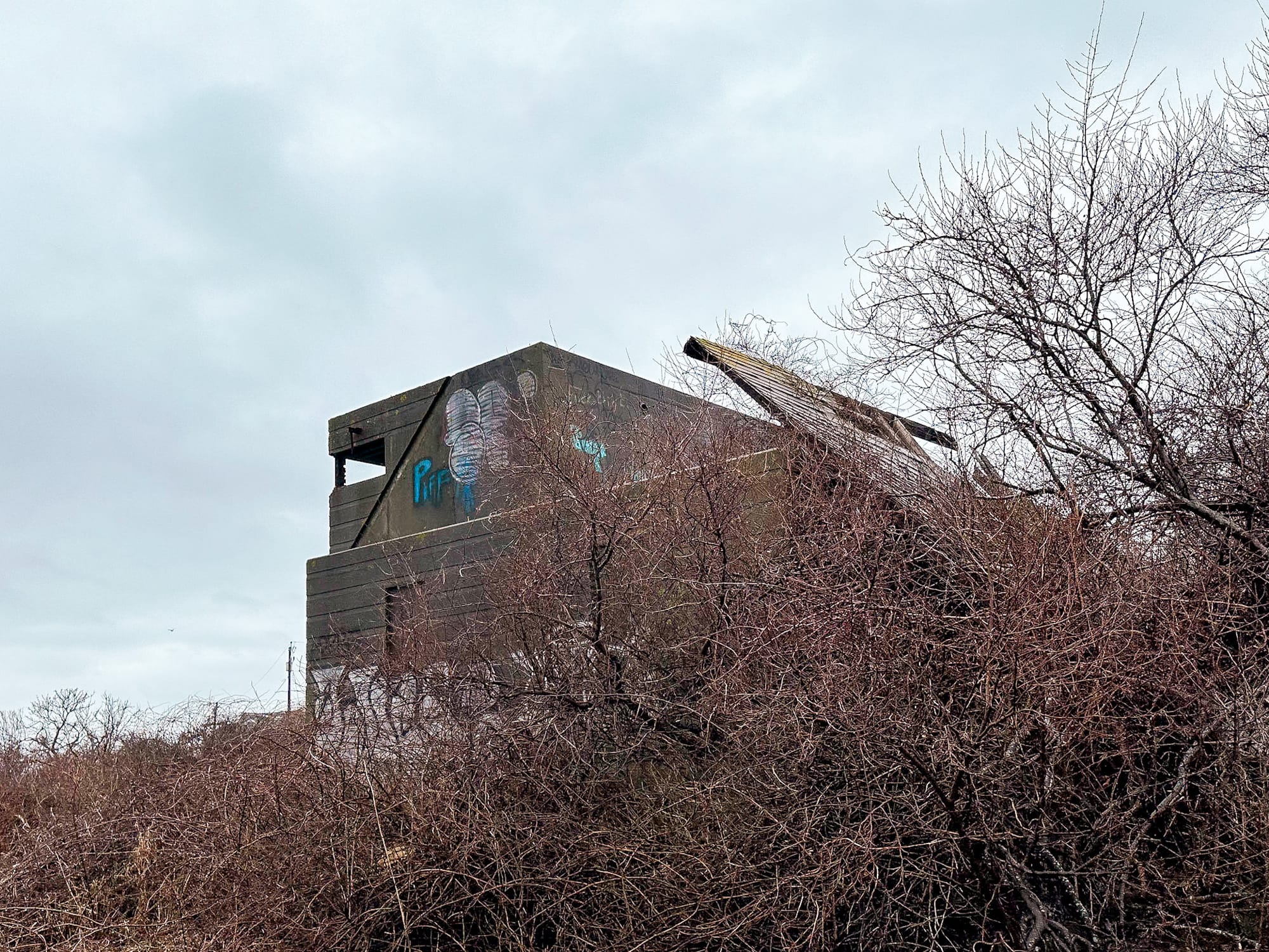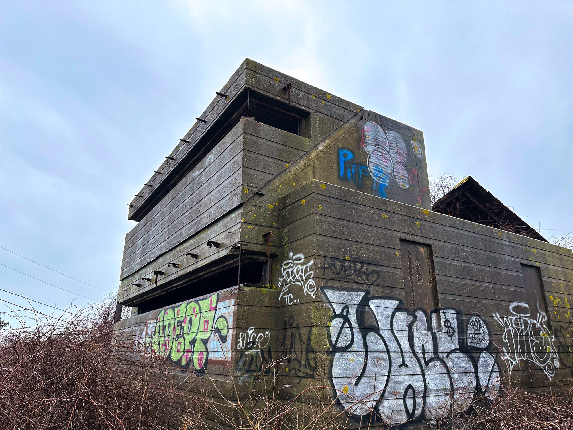 During the war, the military took elaborate steps to hide installations from enemy reconnaissance. Fire Control Tower 1-B was cleverly disguised as a seaside cottage, complete with a pitched wooden roof and clapboard siding. To passing boats, it appeared as just another coastal home — concealing the concrete observation post within.