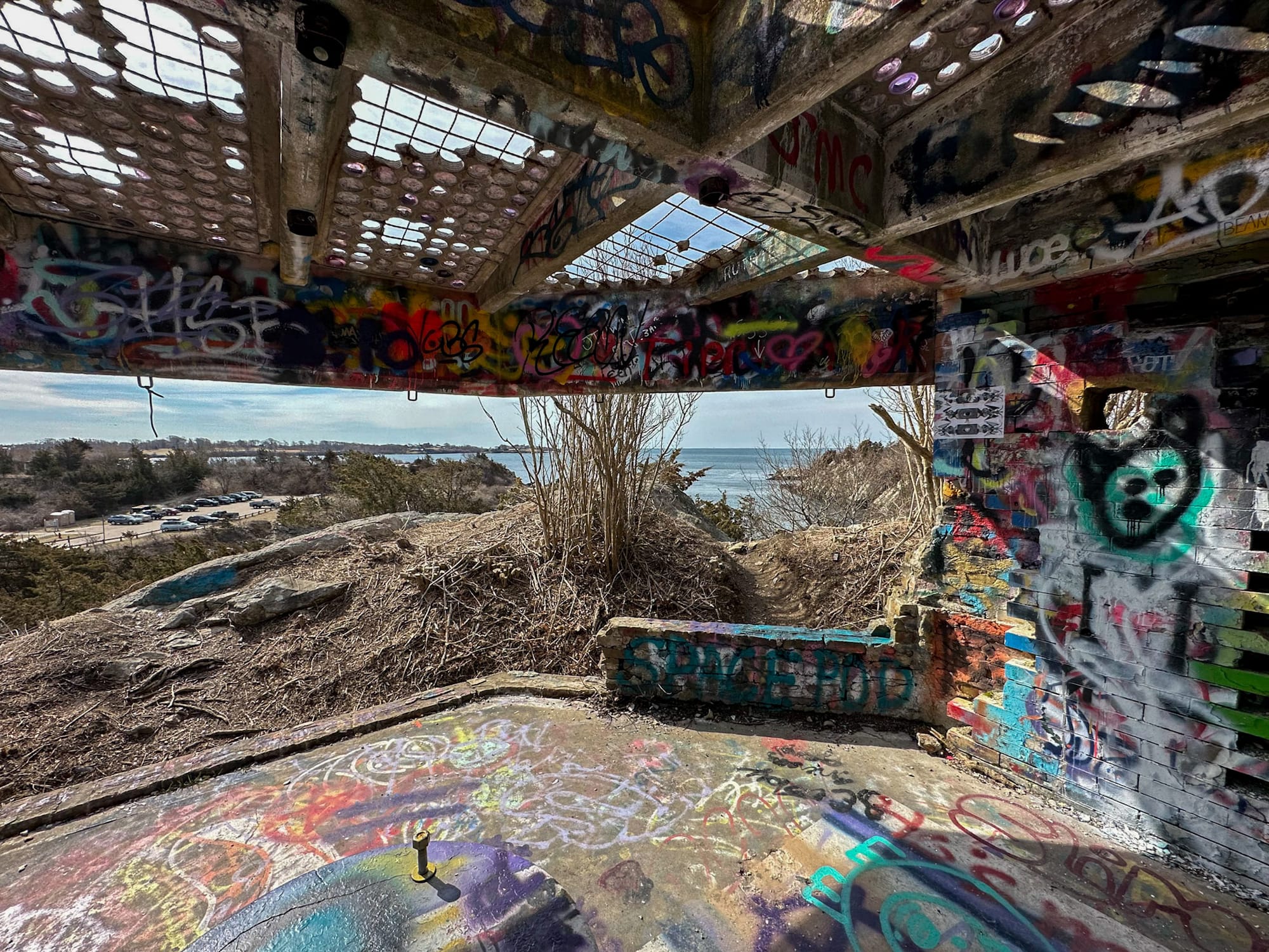 The abandoned Fort Wetherill Mine Observation Station in Jamestown, Rhode Island, sits perched high on a windswept hill overlooking Narragansett Bay.